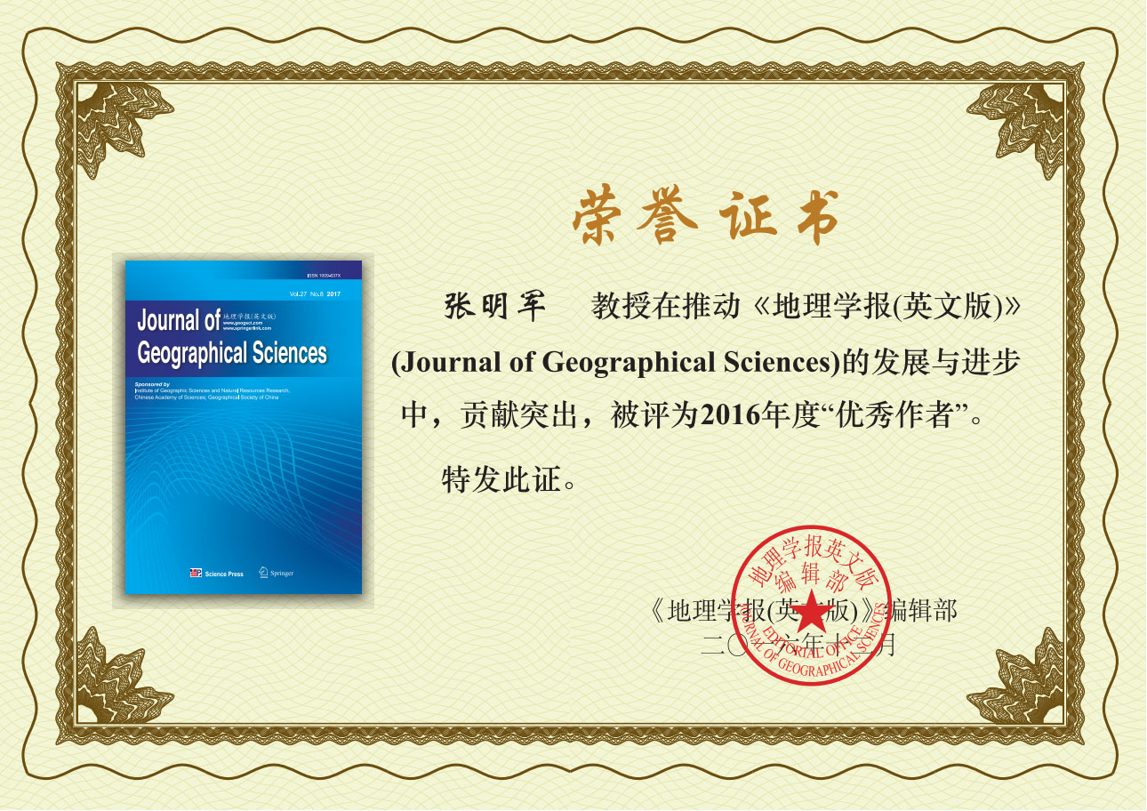 近日,我院教师张明军、王圣杰荣获《地理学报(英文版)》(《Journal of Geographical Sciences》)2016年度“优秀作者”称号,以表彰其在推动该期刊发展和进步中的突出贡献。