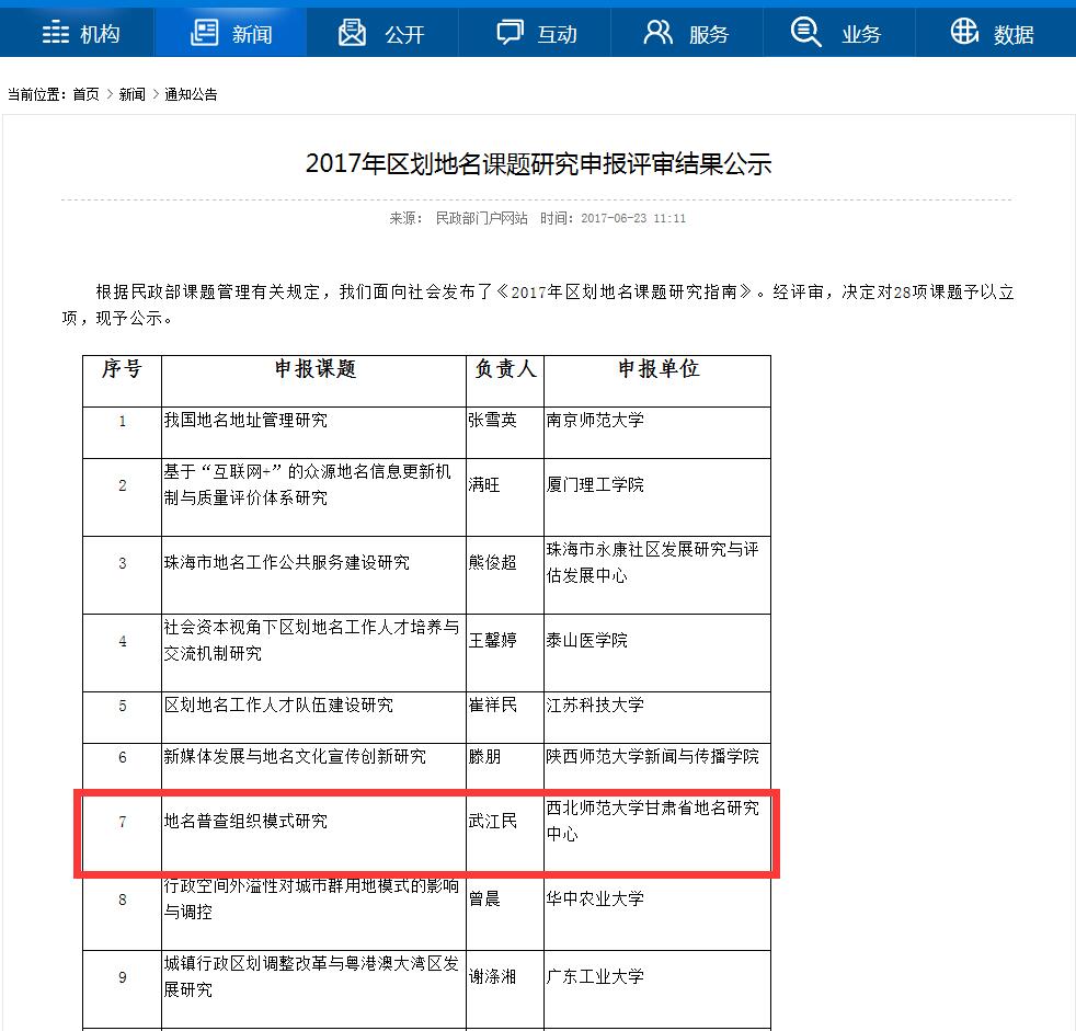 2017年6月23日,中华人民共和国民政部发布2017年区划地名课题研究申报评审结果公示,我院教师武江民副教授和党国锋副教授申报的《地名普查组织模式研究》项目成功获得审批立项。