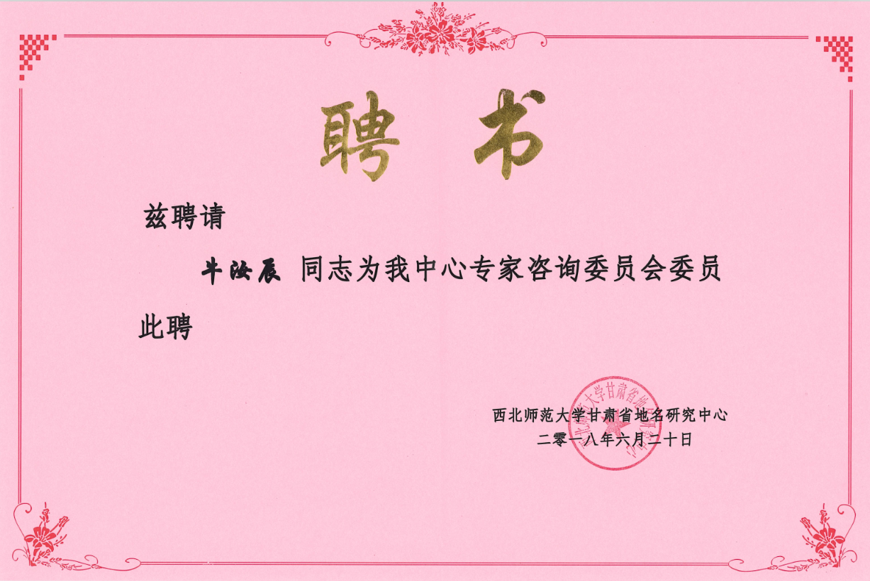 会议由党国锋副教授主持并致欢迎词,聘任牛汝辰先生为甘肃省地名研究中心专家咨询委员会委员。并由张明军院长为牛汝辰先生颁发聘书。