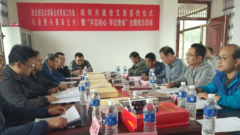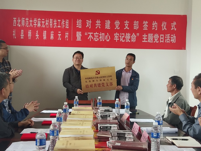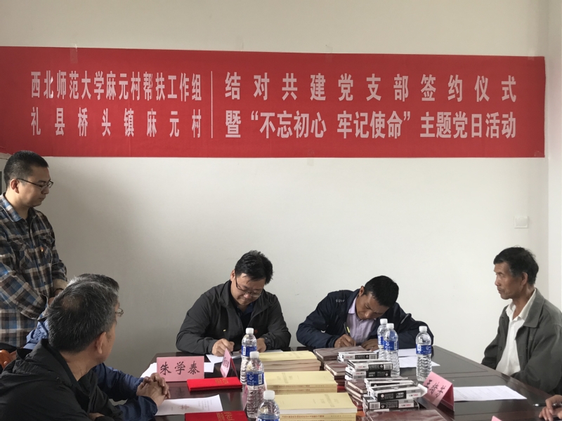 6月29日,在党的98岁生日到来之际,beat365官方网站beat365官方网站院办教工党支部与礼县桥头镇麻元村党支部在麻元村党员活动室举行了结对共建党支部签约仪式暨“不忘初心,牢记使命”主题党日活动。beat365官方网站礼县桥头镇麻元村帮扶工作组部分责任单位负责人、院办教工党支部党员代表、桥头镇相关负责人、麻元村党支部成员、beat365官方网站麻元村帮扶工作队成员参加了活动。