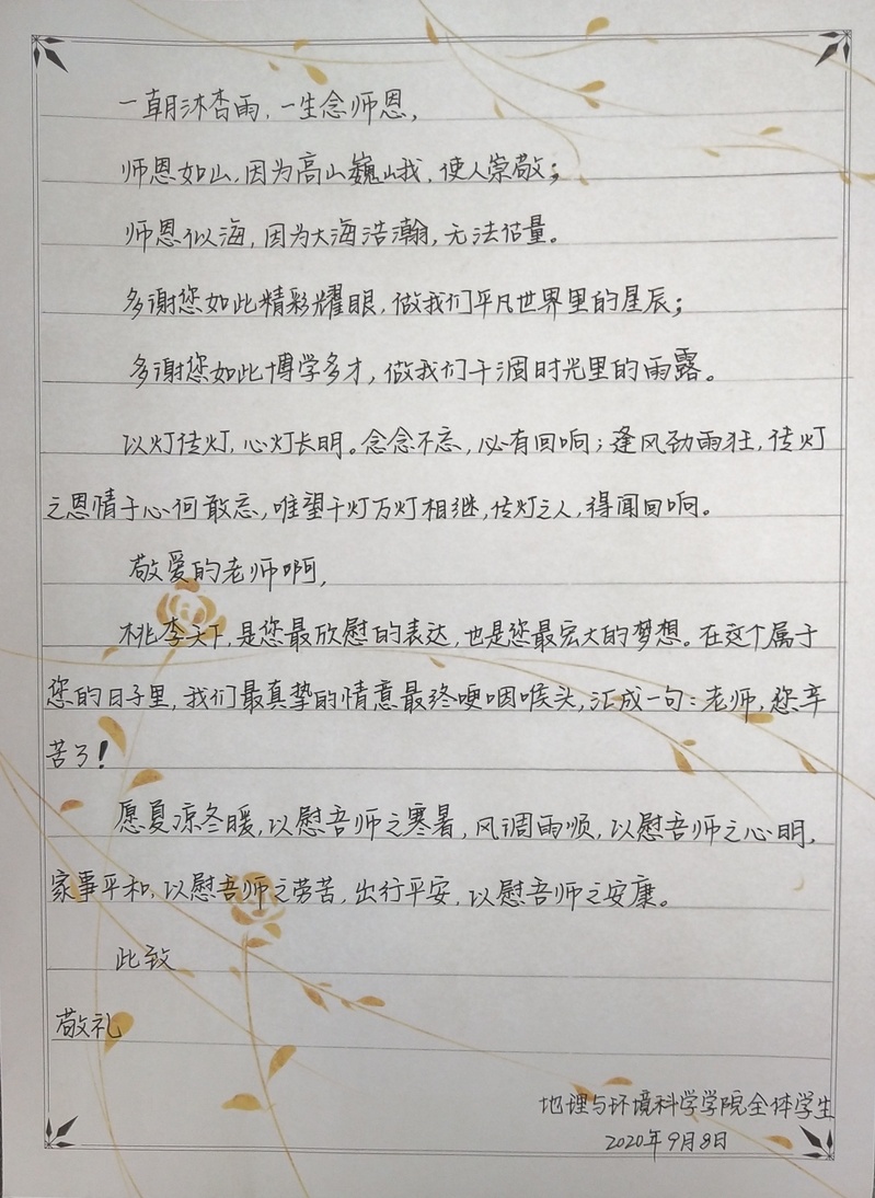 教师节来临之际,学院学生手写书信一封,诚祝各位老师教师节快乐!