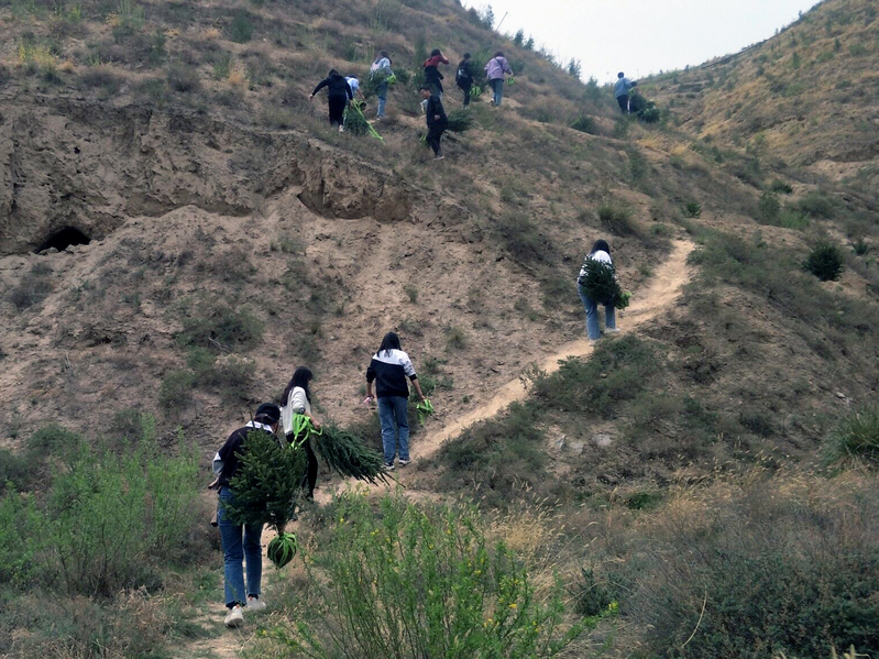 植树现场同学们干劲十足,热火朝天,争先恐后屡次从山脚下向山顶搬运树苗和工具。带队老师给同学们加油鼓励,并与同学们一起挥锹铲土,栽下一棵棵寄予着希望和充满爱心的树苗,最后全体人员在翠绿的山坡上合影留念。