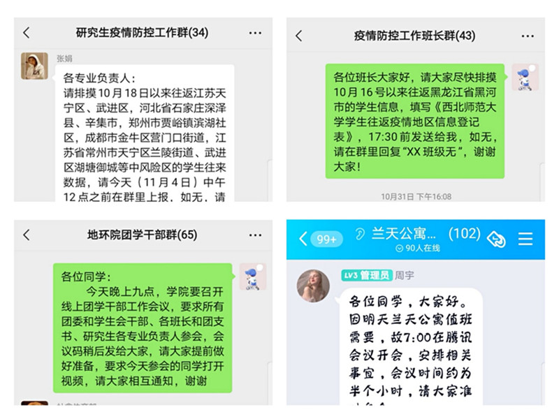 真情传递大爱,奉献诠释职责,此次疫情防控让辅导员成为了广大学生心中的“N95”。为了学生,哪里都是办公室,坚持24小时在岗在线,密切掌握学生健康、思想动态。通过各种形式和途径积极开展疫情防护知识科普,同时借机做好学生线上安全教育、防电信诈骗教育、社会责任感教育,帮助学生做好防疫期间心理自我调适,缓解因疫情导致的负面情绪和行为,引导学生理性抗疫。