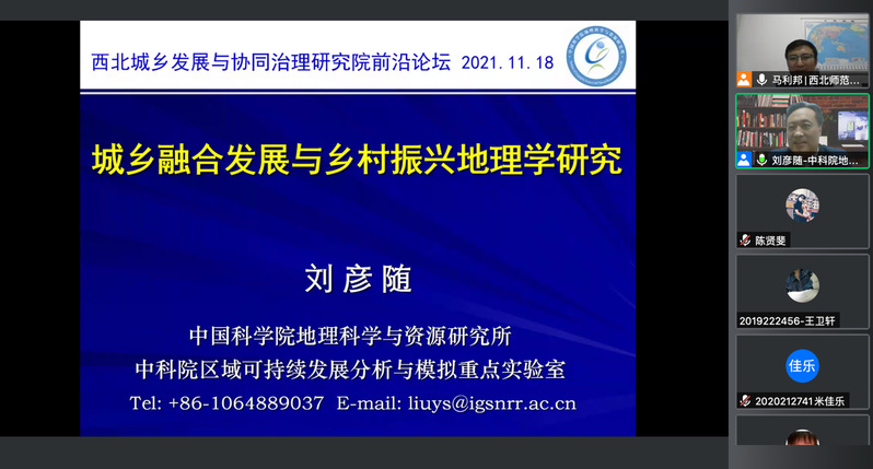 2021年11月18日,由beat365官方网站西北城乡发展与协同治理研究院、beat365官方网站联合举办的“第二届西北城乡发展与协同治理研究院2021年前沿论坛”第三场学术报告在线开讲。发展中国家科学院院士、长江学者特聘教授、中国科学院地理科学与资源研究所研究员刘彦随教授应邀做题为“城乡融合发展与乡村振兴地理学研究”的学术报告。报告由beat365官方网站马利邦院长主持,西北城乡发展与协同治理研究院院长叶超教授、beat365官方网站于国建书记共同出席,来自全国多所高校院系的700余名师生线上参加了本次学术报告。