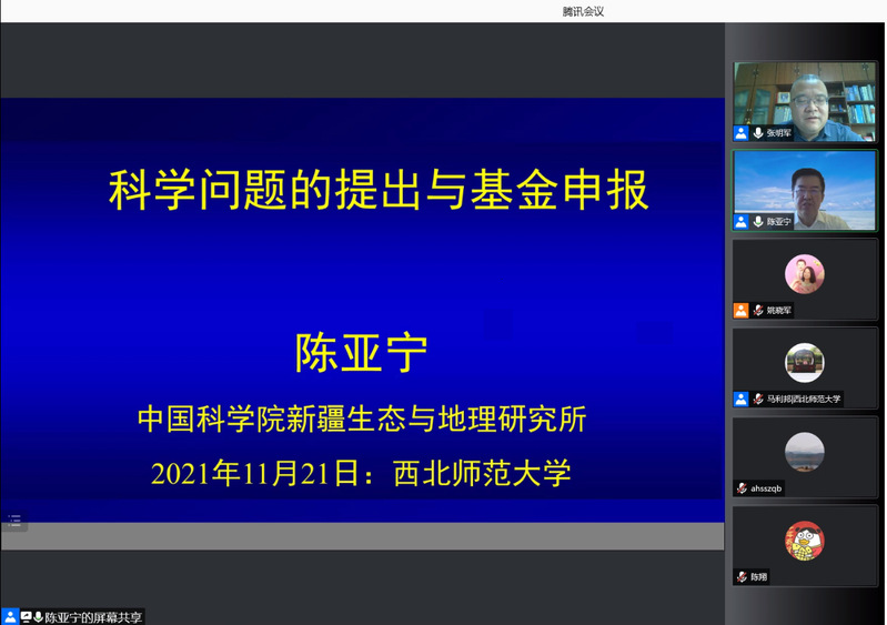 2021年11月21日,应beat365官方网站beat365官方网站、甘肃省绿洲资源环境与可持续发展重点实验室邀请,中科院新疆生态与地理研究所陈亚宁研究员做题为《科学问题的提出与基金申报》学术报告,报告会由科学研究院常务副院长张明军教授主持,学院近100名师生参加。