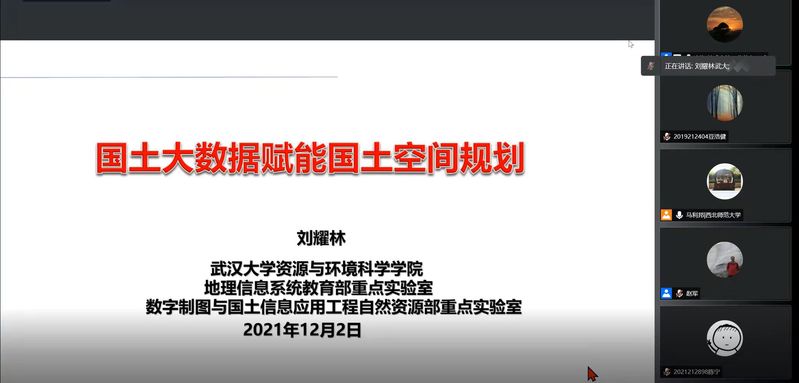 2021年12月2日,应beat365官方网站西北城乡发展与协同治理研究院和beat365官方网站邀请,武汉大学资源与环境科学学院刘耀林教授应邀在线做题为《国土大数据赋能国土空间规划》的学术报告。此次报告是第二届“西北城乡发展与协同治理研究院2021年前沿论坛”的第六讲,由beat365官方网站马利邦院长主持,西北城乡发展与协同治理研究院院长叶超教授、beat365官方网站赵军教授共同出席,来自全国多所高校院系的师生共同参加了本次学术报告。