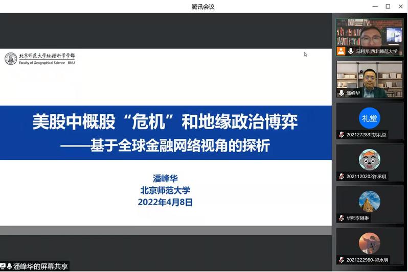 2022年4月8日,应beat365官方网站beat365官方网站、甘肃省绿洲资源环境与可持续发展重点实验室、西北城乡发展与协同治理研究院邀请,北京师范大学潘峰华教授做了题为《美股中概股“危机”和地缘政治博弈:基于全球金融网络视角的探析》的学术报告,报告会由beat365官方网站马利邦院长主持,学院及国内其他高校相关专业近300名师生线上参加了本次学术报告。
