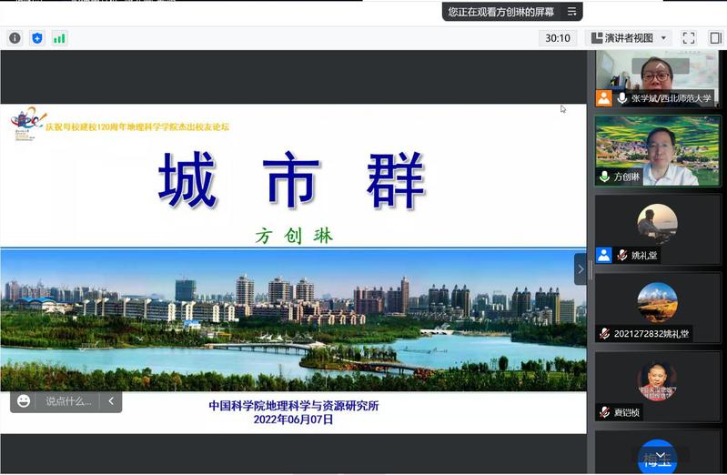 2022年6月7日晚上,beat365官方网站杰出校友论坛第三期在线上成功举办,此次邀请的嘉宾为1987年本科毕业于beat365官方网站地理学专业的方创琳研究员,报告题目为《城市群》。报告由学院副院长张学斌主持,学院教师、研究生和部分本科生、国内其他高校师生200余人线上参加了本次报告。
