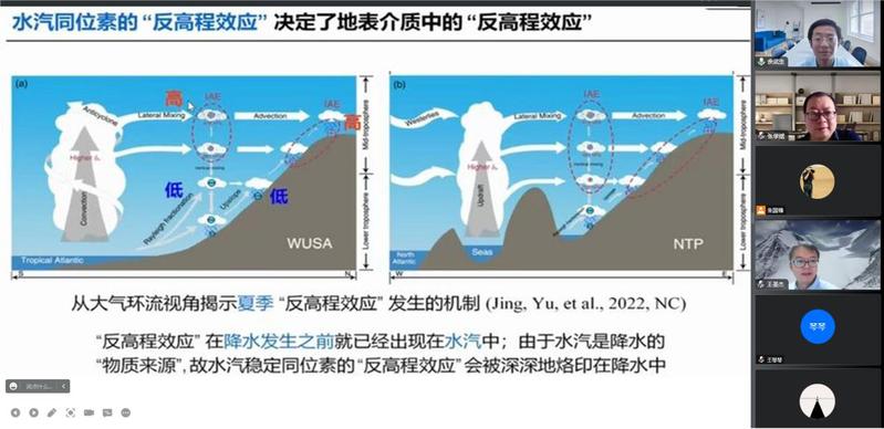 余武生研究员主要从大气水汽稳定同位素的新视角,系统地揭示不同地表介质稳定同位素出现“反高程效应”(IAE)的原因,指出导致 IAE 的两个过程:(1) 来自遥远源区的具有较高同位素值的水分供应;(2) 沿水分输送路径的对流层中下层和中层之间的强烈横向混合。余武生研究员指出在利用稳定同位素古高度计之前,需要仔细考虑山体不同隆升阶段水汽来源和水汽输送路径的变化及其对稳定同位素值的影响。
