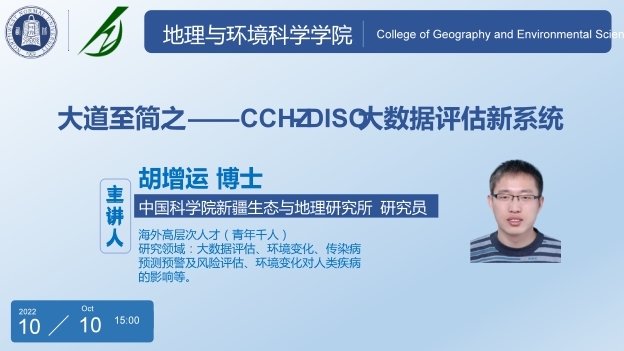2022年10月10日,应beat365官方网站beat365官方网站、甘肃省绿洲资源环境与可持续发展重点实验室邀请,中国科学院新疆生态与地理研究所胡增运研究员做了题为大道至简之——CCHZ-DISO大数据评估新系统的学术报告。报告会由beat365官方网站焦亮副院长主持,学院教师、研究生以及国内其他高校相关专业300余名师生线上参加了本次报告。
