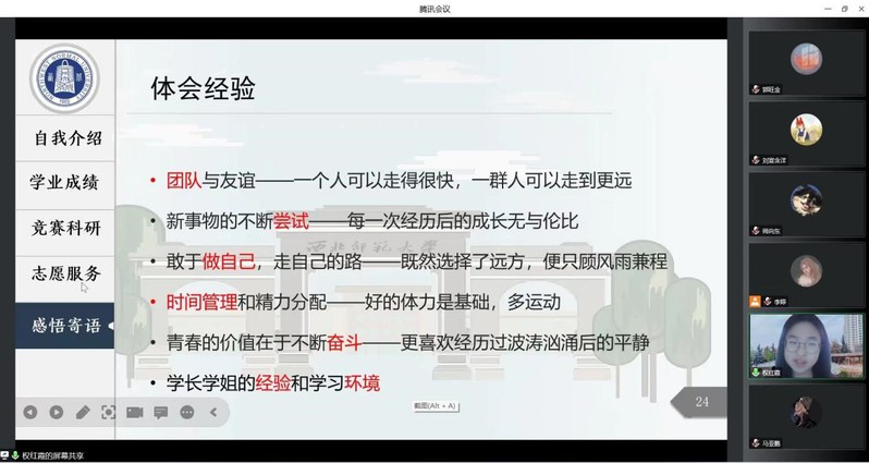 权红霞着重从学术与社会实践两方面向同学们分享了自己的获奖心得体会。她通过多角度、多方面的活动掠影分享,向大家展示了自己丰富多彩的大学生活,强调了要学会“自洽”与团队协作,建议同学们在合理的时间管理和精力分配下,勇于为实现自己青春的价值而努力奋斗,坚决杜绝“躺平”,更要勇于磨练自己心性和意志,时刻让自己保持乐观向上的心态。