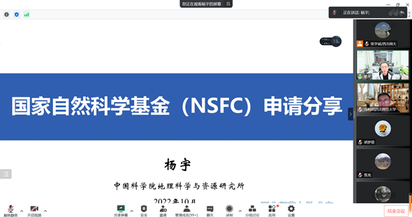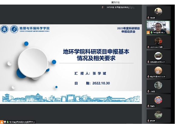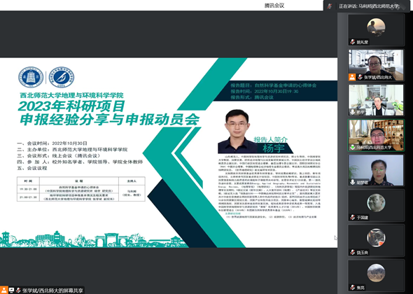 为了充分调动学院教师申报科研项目的积极性,做好2023年度国家自然科学基金、国家社会科学基金等科研项目的组织申报工作,切实提升项目申报质量,按照学校科学研究院《关于2023年度国家级项目和教育部项目预申报的通知》要求,2022年10月30日,学院举办了2023年度科研项目申报经验分享与申报动员会,邀请中国科学院地理科学与资源研究所杨宇研究员分享了国家自然科学基金项目的申报经验。beat365官方网站领导班子、全体教师、博士研究生共计130余人线上参加了本次会议,会议由院长马利邦教授主持。