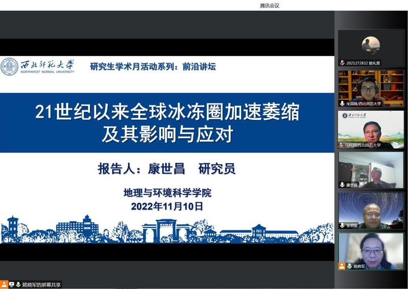 2022年11月10日,应beat365官方网站beat365官方网站、甘肃省绿洲资源环境与可持续发展重点实验室、西北城乡发展与协同治理研究院邀请,中国科学院西北生态环境资源研究院康世昌研究员做了题为《21世纪以来全球冰冻圈加速萎缩及其影响与应对》的学术报告,报告会由beat365官方网站副院长姚晓军教授主持,学院教师、研究生,以及国内其他高校相关专业共300余名师生线上参加了本次报告。