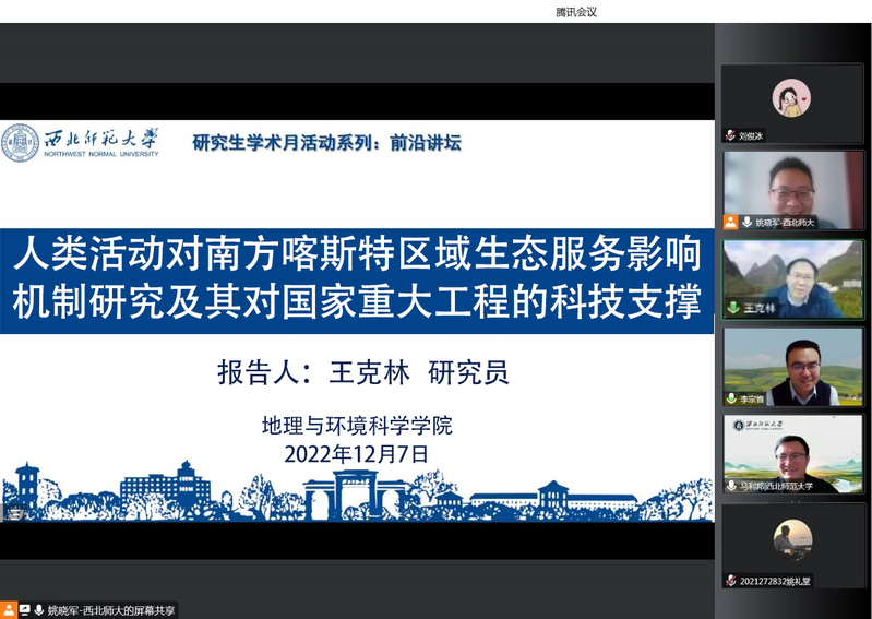 2022年12月7日,应beat365官方网站beat365官方网站、甘肃省绿洲资源环境与可持续发展重点实验室、西北城乡发展与协同治理研究院邀请,中国科学院亚热带农业生态研究所王克林研究员做了题为《人类活动对南方喀斯特区域生态服务影响机制研究及其对国家重大工程的科技支撑》的学术报告,报告会由beat365官方网站特聘教授李宗省研究员主持,学院教师、研究生共300余名师生线上参加了本次报告,此次报告是研究生学术月“前沿讲坛”第四讲。