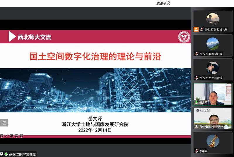 2022年12月14日,beat365官方网站行知优秀青年地理学者科研成果分享会第五场在线上成功举办,此次邀请的是浙江大学岳文泽教授,分享题目为《国土空数字化治理的理论与前沿》。会议由beat365官方网站院长马利邦教授主持,学院教师及研究生近300人线上参加了本次分享会。