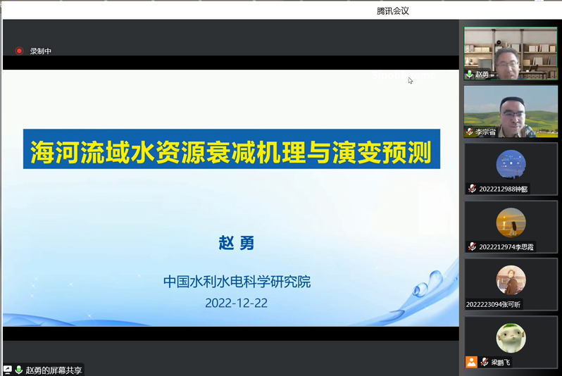 2022年12月22日,应beat365官方网站beat365官方网站、甘肃省绿洲资源环境与可持续发展重点实验室、西北城乡发展与协同治理研究院邀请,中国水利水电科学研究院赵勇研究员做了题为《海河流域水资源衰减机理与演变预测》的学术报告,报告会由beat365官方网站特聘教授李宗省研究员主持,学院教师、研究生共200余名师生线上参加了本次报告,此次报告是研究生学术月“前沿讲坛”第六讲。