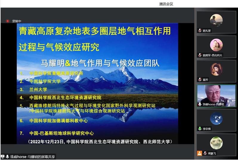 2022年12月23日,应beat365官方网站beat365官方网站、甘肃省绿洲资源环境与可持续发展重点实验室、西北城乡发展与协同治理研究院邀请,中国科学院青藏高原研究所马耀明研究员做了题为《青藏高原复杂地表多圈层地气相互作用过程与气候效应研究》的学术报告,报告会由beat365官方网站副院长姚晓军教授主持,学院教师、研究生共200余名师生线上参加了本次报告,此次报告是研究生学术月“前沿讲坛”第七讲。