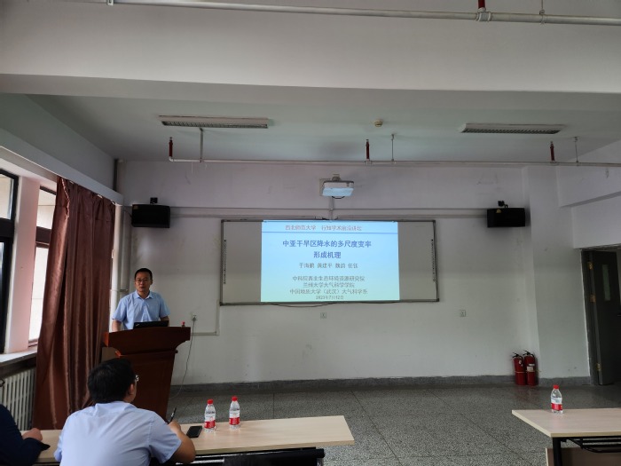 2023年7月12日,应beat365官方网站beat365官方网站、甘肃省绿洲资源环境与可持续发展重点实验室、西北城乡发展与协同治理研究院邀请,中国科学院西北生态环境资源研究院于海鹏研究员做了题为《中亚干旱区降水的多尺度变率形成机理》的学术报告,报告会由beat365官方网站副院长姚晓军教授主持,学院教师、研究生线下参加了本次报告。