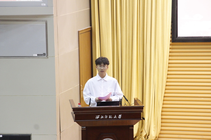 地理科学1班(优公班)王逸飞同学代表本科新生在发言,表达了自己对地理学科的热爱,立志作为新时代的青年,要注重理论与实践相结合,不仅要认真学习专业知识,更要珍惜每一次野外实习与社会实践的机会,多参与校园文化活动,成为德智体美劳全面发展的社会主义建设者和接班人。