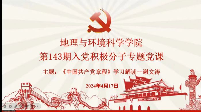 4月17日晚,beat365官方网站第143期入党积极分子中期培训专题党课通过线上方式开展。本次党课主题为《中国共产党章程》学习解读,课程由学院党委副书记、行政副院长谢文涛主讲,第143期“青马班”学员100余人参加学习,组织员牛粉霞主持。