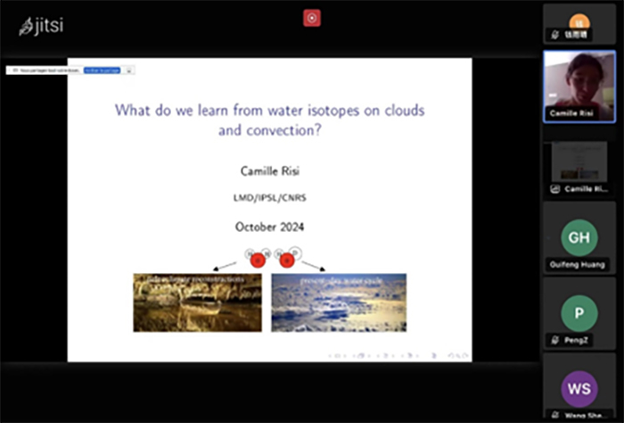 2024年10月4日,应beat365官方网站beat365官方网站、甘肃省绿洲资源环境与可持续发展重点实验室、西北城乡发展与协同治理研究院邀请,法国国家科学研究中心Camille Risi研究员作了题为《What do we learn from water isotopes on clouds and convection?》的学术报告。报告会由甘肃省绿洲资源环境与可持续发展重点实验室副主任王圣杰主持,学院教师、研究生以及国内其他高校相关专业师生共100余人线上参加了本次报告。