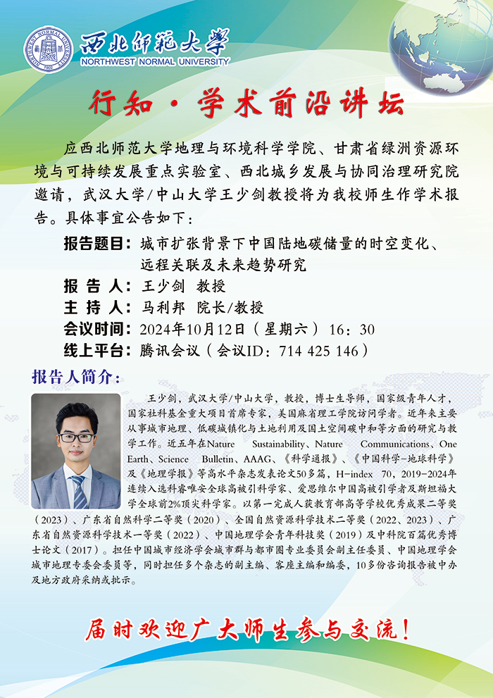 beat365行知•学术前沿讲坛2024-19期:城市扩张背景下中国陆地碳储量的时空变化、远程关联及未来趋势研究