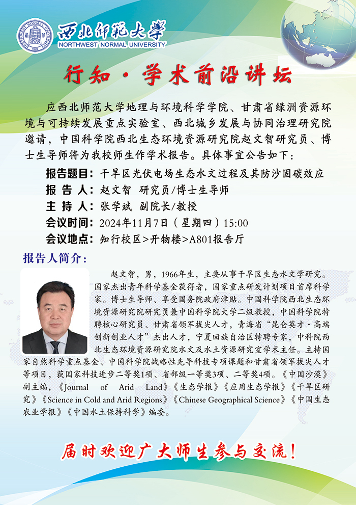 beat365行知•学术前沿讲坛2024-26期:干旱区光伏电场生态水文过程及其防沙固碳效应