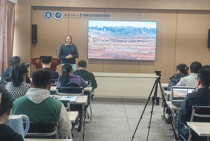 来访期间,Gabriel J. Bowen教授与学院师生分享了水同位素方面的研究进展,作了题为《Water isotope forensics: Tracing people, products, and resources with H and O isotopes》的学术报告,报告系统介绍了水体同位素景观图谱的构建,结合实例分析了氢氧稳定同位素的示踪应用情况,交流活动由甘肃省绿洲资源环境与可持续发展重点实验室副主任王圣杰主持。