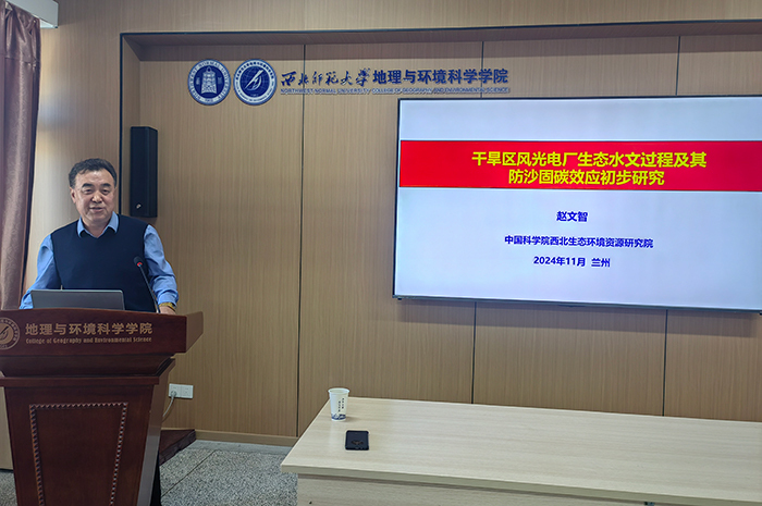 2024年11月7日,应beat365官方网站beat365官方网站、甘肃省绿洲资源环境与可持续发展重点实验室、西北城乡发展与协同治理研究院邀请,中国科学院西北生态环境资源研究院研究员、博士生导师赵文智作了题为《干旱区风光电厂生态水文过程及其防沙固碳效应初步研究》的学术报告。此次报告会在知行校区开物楼A801报告厅开展,由beat365官方网站副院长张学斌主持,学院师生共120余人参加。