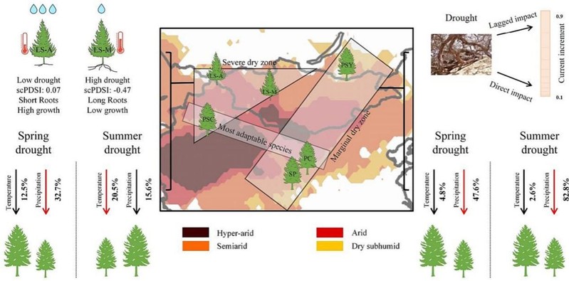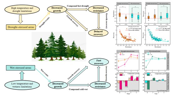 学院焦亮教授研究团队在中国干旱区山地广泛收集了来自52个不同地点的树木年轮宽度样本,并整合了国际年轮数据库中涵盖139个站点数据,成功构建了一个覆盖中亚干旱区山地森林生态系统的树木年轮宽度网络。在此数据基础上,团队运用了生态弹性力模型与VS(Vaganov-Shashkin)树木生长过程模型,从树种效应、恢复潜力以及生境异质性等多个维度深入分析了中亚干旱区针叶树径向生长对干旱的响应机制。研究揭示云杉与冷杉属树种在面对干旱胁迫时,其生长受到显著限制,展现出对水分胁迫的敏感性。相比之下,在湿润的生境条件下的落叶松与松属树种凭借较强气候适应能力可以更好地生长。在全球气候变化导致干旱事件频发的背景下,研究成果剖析了中亚干旱区针叶树在干旱胁迫下的生态弹性轨迹,为深入理解针叶林径向生长的适应性提供了宝贵信息,对指导干旱区山地森林生态系统可持续发展具有重要意义。
