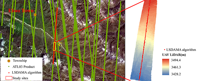 激光测高卫星ICESat-2/ATL08产品为全球提供大范围、高精度地表高程数据,然而在山区该产品(V04版本)精度较低且点云密度较稀疏,不能准确地描述地形起伏特征。论文以定位光子产品ATL03为基础,提出了一种基于局部统计的山区地表高程提取方法(LSDAMA)。通过两次直方图阈值的粗去噪和基于坡度局部拟合的精细化去噪,不仅提高噪声光子去除效果而且增加了山区地面光子保留率;同时,通过沿沿拟合的坡度方向设置动态窗口提高山区地表高程提取精度。