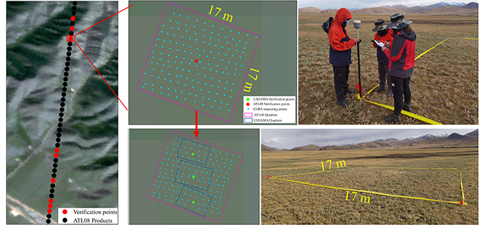 图2. 精度验证实验设计:(a)CORS样方设计;(b)无人机激光雷达测量