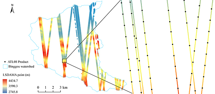 以祁连山区八宝河流域为研究区,分别利用40个样方内777个GPS CORS实测数据组成的137个验证点、无人机激光雷达测量数据进行精度验证。结果表明,在丘陵和山地区本算法提取的地表光子比ATL08官方产品精度更高, 尤其是在坡度大于20°的山地区,均方根误差(RMSE)由ATL08产品的2.72 m提高至0.60 m,平均偏差(MBE)由-1.27 m提高至0.04 m。同时,本算法极大地提高了地表光子保留率,相邻光子间隔由ATL08产品的100 m缩小至2-7 m, 能够更详细地描述地形起伏变化特征,从而为山区地表高程变化监测提供更为可靠的基础数据。