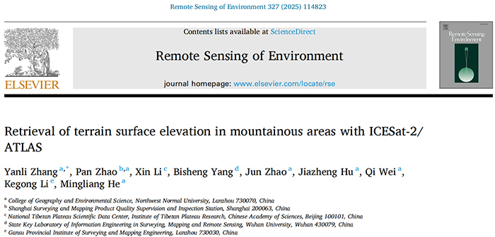 近日,遥感领域国际顶级期刊Remote Sensing of Environment发表了张彦丽教授团队的最新研究成果“Retrieval of terrain surface elevation in mountainous areas with ICESat-2/ATLAS”。课题组研究生赵攀为第二作者,已就职于上海市测绘产品质量监督检验站。本研究的共同作者还有来自中国科学院青藏高原研究所李新研究员、武汉大学杨必胜教授、beat365官方网站赵军教授和甘肃省测绘工程院的李克恭正高级工程师。本项研究得到了国家自然科学基金(42361058和41871277)项目资助。
