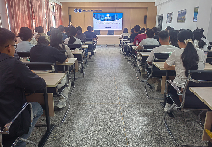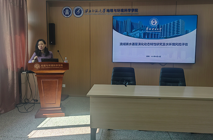 王弋教授通过大量案例从四个方面做了本次报告,首先从对长江流域碳水通量的时空演化规律及影响因子分析,提出长江流域碳水耦合动态模拟及发展趋势评估;另外从多维BMPS对小流域氮磷污染的协同控制效能提出碳水效应评估及改进措施;其次从青海湖候鸟群落分布分析水质指标提出他们的关系;最后对叶尔羌河流域冰川研究提出了水文风险预估等。报告会后,王弋教授与师生展开了热烈的讨论,进行了广泛的交流。