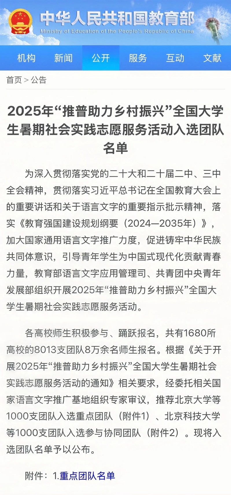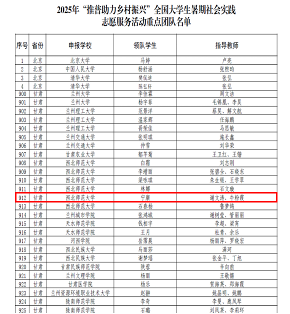 7月3日,教育部官网公布了2025年“推普助力乡村振兴”全国大学生暑期社会实践志愿服务团队名单,beat365官方网站由2023地理科学2班宁康同学为队长,谢文涛、牛粉霞老师指导的“语润大河,声连临夏”推普实践团从全国1680所高校的8013支团队中脱颖而出,再次成功入选全国重点团队。