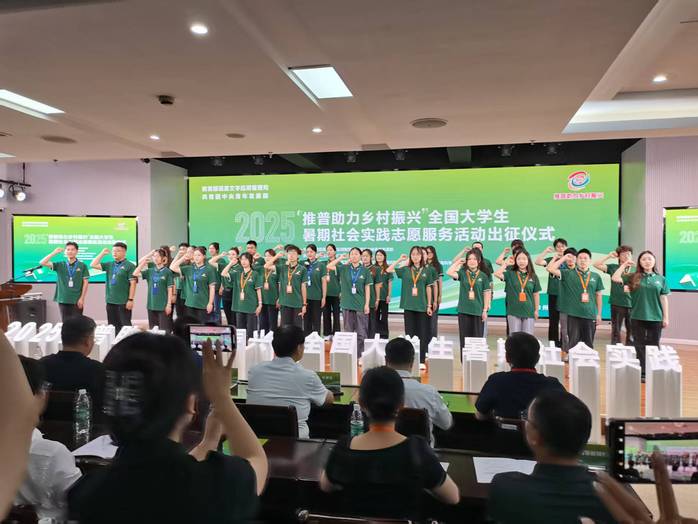 王晖致辞,他强调严格贯彻落实习近平总书记在全国教育大会上的重要讲话和关于语言文字的重要指示批示精神。同学们要珍惜这次深入基层的宝贵机会,带着思考去实践,带着热情去服务,贡献自己的青春力量。随后志愿者代表在出征仪式上庄严宣誓。