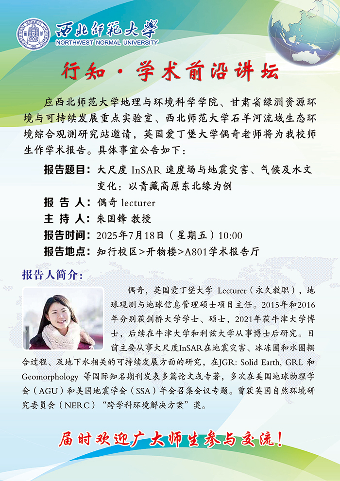 beat365行知•学术前沿讲坛2025-15期:大尺度 InSAR 速度场与地震灾害、气候及水文变化:以青藏高原东北缘为例