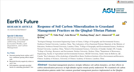 近日,beat365官方网站曹建军团队在青藏高原草地管理与碳循环研究方向取得重要突破,研究成果以“Mechanisms of Grassland Management Impacts on Soil Carbon Mineralization”为题发表于《Earth's Future》期刊。该期刊由美国地球物理学会(AGU)主办,聚焦地球系统与人类活动交互关系研究,是环境变化与可持续发展领域具有重要国际影响力的学术期刊。