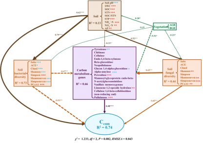 结果显示:不同草地管理方式对青藏高原高寒草地土壤碳矿化过程产生了显著影响,且表现出明显的垂直分异特征。表层土壤(0–0.15m)中,SGG的累积碳矿化量最高(2993.32 mg CO2-C kg−1),是AAG的1.5倍;深层土壤(0.15–0.30m)中,CGG的累积碳矿化量最大(2355.18 mg CO2-C kg−1),比PEG高50%。多因子分析显示,土壤理化特性、碳降解功能基因和真菌多样性共同解释了74%的碳矿化变异,其中土壤性质是最主要的直接驱动因子(路径系数=0.62)(如图1)。值得关注的是,细菌多样性与累积碳矿化量的负相关关系,这暗示微生物残体积累和矿物保护机制在土壤碳稳定中具有重要作用。
