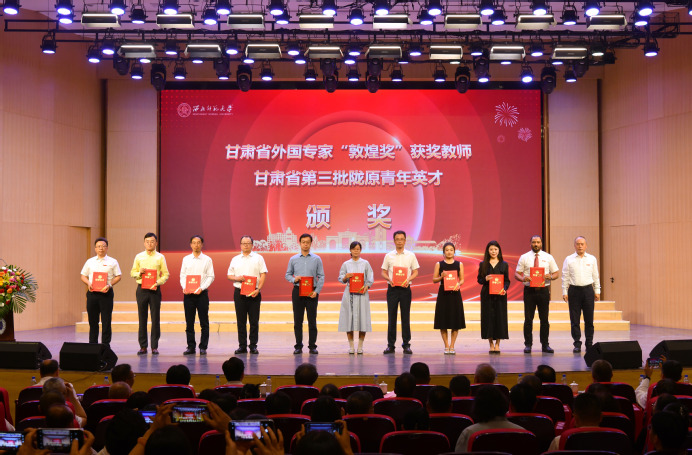 校长、党委副书记王占仁为获得甘肃省外国专家“敦煌奖”和“甘肃省第三批陇原青年英才”称号的教师颁奖