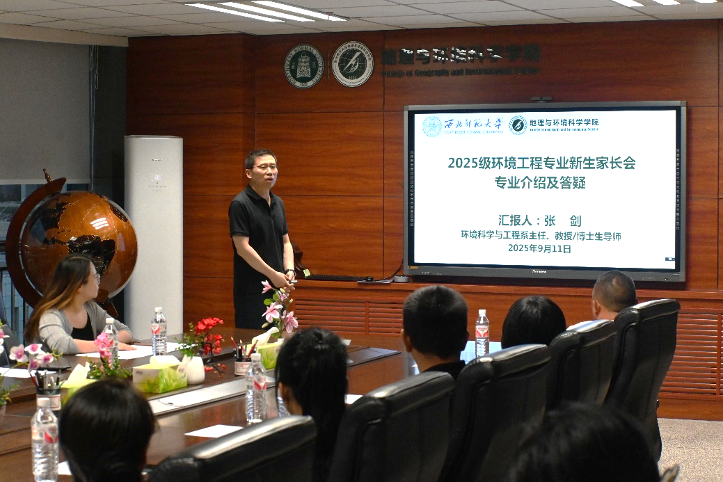 2025级环境科学与工程系家长见面会,由班主任杜勤勤老师主持,潘竟虎副院长重点介绍了学院的整体情况,系主任张剑教授介绍了学院环境工程专业的发展历史、专业特色以及专业发展趋势,谢文涛副书记围绕学生安全管理与职业规划等问题和家长进行了交流,与会家长就专业学习、未来就业、考研升学等家长关心的问题进行了深入的交流和探讨。