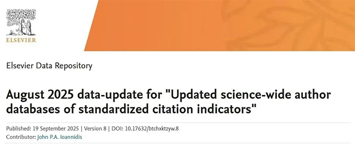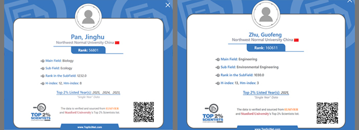 2025年9月19日,爱思唯尔(Elsevier)与美国斯坦福大学联合发布了第八版《全球前2%顶尖科学家榜单2025》(World's Top 2% Scientists 2025),从全球近700万名科学家中筛选出世界Top 2%的科学家,包括了22个领域和174个子学科。数据显示学院潘竟虎教授和朱国锋教授入选2025年“全球前2%顶尖科学家榜单”,潘竟虎排名位列全国5560,入选学科为生态学/环境科学领域,朱国锋排名160611位,入选学科为环境工程学。
